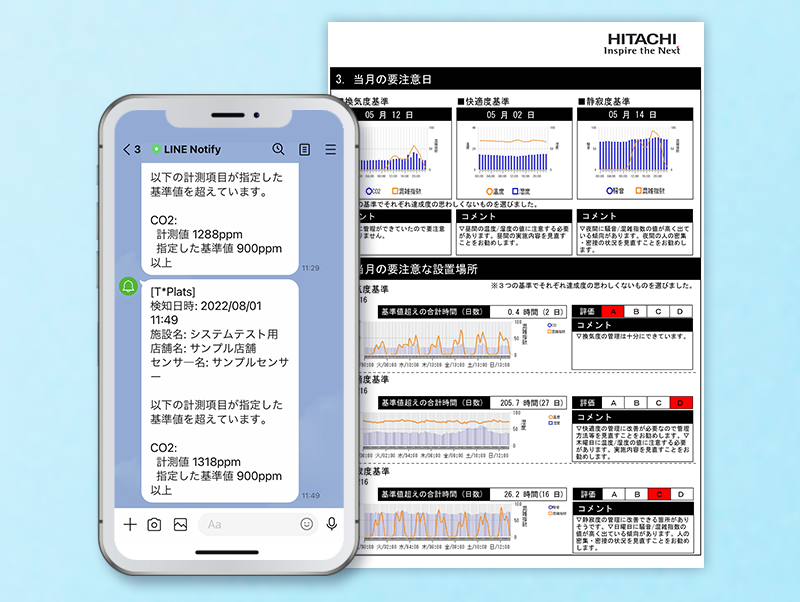 あらかじめ設定した規定値に応じてアラートを通知。SNSやメールで注意喚起をする仕組みを提供します。また、蓄積した計測データを基に作成された定期レポートで定量的に評価結果を確認できるため、衛生管理の改善や対策効果の最大化に貢献します。