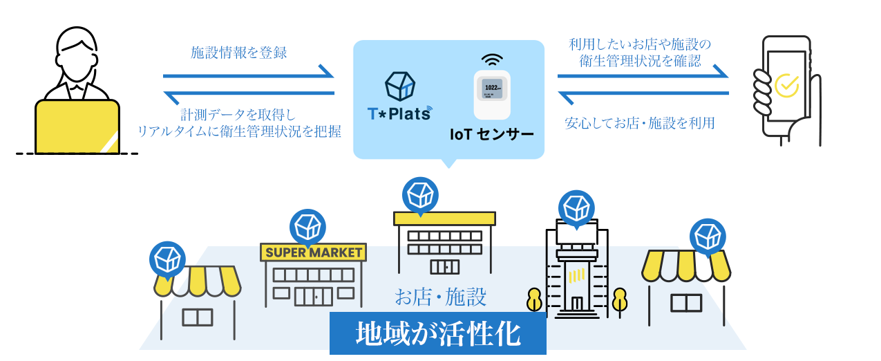 T*PlatsにIoTセンサーを接続し、施設情報を登録します。 IoTセンサーをお店や施設内に設置することで利用を始められます。